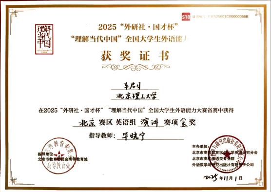 2025年11月1日,“外研社·国才杯”全国英语演讲大赛北京赛区比赛圆满落幕。来自北京各大高校的48名选手同台竞技,开元网站登录入口学子表现优异,在外国语学院毕晓宁、罗勤两位老师的精心指导下,精工书院北理鲍曼学院2023级本科生车启月荣获金奖并晋级国赛,特立书院国际组织与全球治理专业2025级本科生陈梓铫荣获银奖。