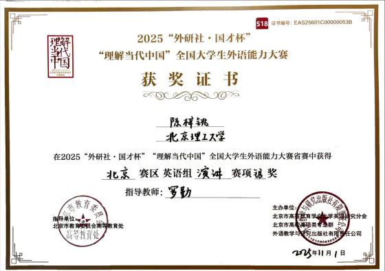 “外研社·国才杯”全国英语演讲大赛是展现全国高校学生跨语言、跨文化交际能力的重要平台,旨在提升学生的外语表达能力和跨文化交际能力,促进中外文化交流。近年来,外国语学院高度重视学科竞赛在人才培养中的关键作用,坚持“以赛促学、以赛促教”。学院积极组织和指导全校学生参加各项国家级外语类竞赛,屡屡斩获佳绩。北理工学子在此次比赛中的优异表现,不仅展现了学子们深厚的语言功底和文理兼长的知识底蕴,也彰显了学院和学校在培养具有国际视野和家国情怀的高素质人才方面的卓越成效。
